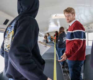 El proyecto de dos años comenzó este invierno, con 15 estudiantes de la clase de principios de ingeniería de Kristi Lebkowsky midiendo el autobús y desarrollando conceptos de diseño iniciales para convertirlo en un espacio de trabajo móvil funcional.