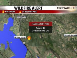 CONDADO DE KLAMATH, Oregón. – El incendio de Hagelstein se encuentra al este de la autopista 97 y Modoc Point, a unos 22,5 kilómetros al norte de Klamath Falls. El incendio se desplaza hacia el este y se estima que abarca 32 hectáreas. Los bomberos acudieron al lugar el lunes por la noche.
