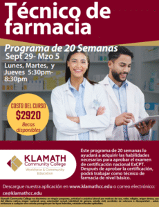 El Colegio Comunitario de Klamath (KCC) ofrece un próximo programa de formación de técnico farmacéutico de 20 semanas diseñado para preparar a los estudiantes para carreras gratificantes en la industria farmacéutica. El programa se impartirá tres días a la semana por las tardes, Lunes, Martes, y Jueves de 5:30 p. m. a 8:30 p. m., lo que lo hace conveniente para adultos que trabajan y personas con agendas ocupadas.