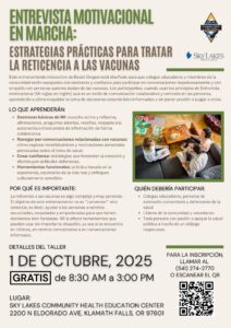 Los invitamos a aprender en este maravilloso taller que se realizará el 1 de octubre de 2025 en el Centro de Educación para la Salud Comunitaria Sky Lake, ubicado en 2200 N. Eldorado Ave, Klamath Falls, Oregón 97601.