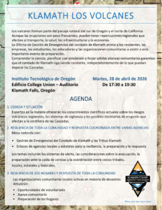 La Oficina de Gestión de Emergencias del Condado de Klamath invita a los residentes locales de la Cuenca de Klamath, líderes empresariales, estudiantes, educadores y organizaciones comunitarias a asistir a este importante evento de preparación relacionado con los volcanes.