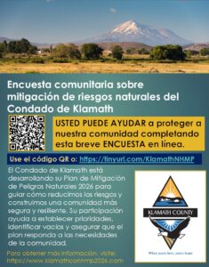 El Condado de Klamath está creando un plan para el año 2026 para prepararse para desastres naturales como incendios, inundaciones y tormentas. Su opinión es muy importante y ayudará a hacer nuestra comunidad más segura.