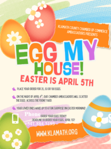 Para una sorpresa divertida de Pascua, puedes ordenar la entrega de huevos a través de la Klamath County Chamber of Commerce; los huevos se colocarán en los jardines la noche del 4 de abril y la fecha límite para ordenar es el 1 de abril.