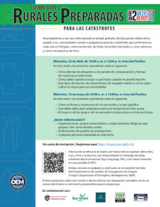 Presentado por el Departamento de Gestión de Emergencias de Oregón (OEM), en colaboración con el Servicio de Extensión de la Universidad Estatal de Oregón, Oregon Sea Grant, Upstream Access, Woodburn CERT y la Asociación de Agencias del Área para el Envejecimiento y las Discapacidades.