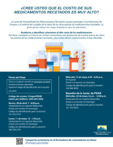 Por favor, acérquese a compartir su historia en un foro comunitario con el personal de la junta directiva sobre cómo le han afectado los precios de los medicamentos recetados y los costos de los mismos.