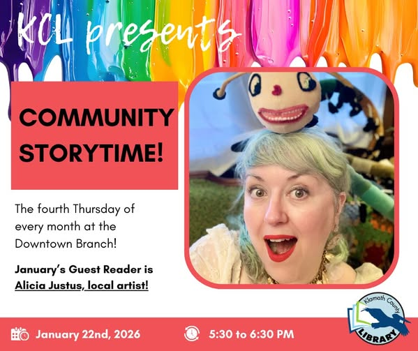 January 22 @ 5:30 pm - 6:30 pm Community Story Time – The Fourth Thursday each Month 5:30 to 6:30 – Hosted by The Klamath County Library